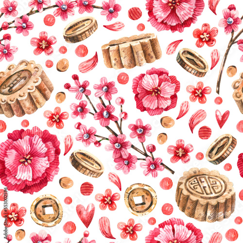 Watercolor Chinese New Year pattern with moon cakes, flowers and gold coins on a white background. Traditional Chinese pattern. Wrapping paper, postcards, wallpapers.