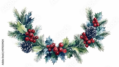 Watercolor Christmas Garland with Holly Berries, Pine Cones, and Fir Branches Beautifully Arranged