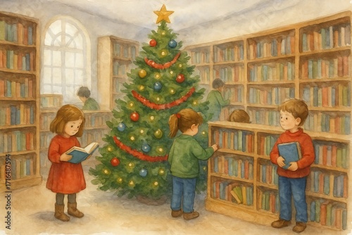 Watercolor christmas scene in library with children reading books near decorated tree for holiday season celebration