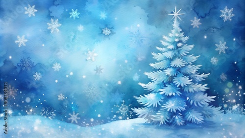 Watercolor Christmas Tree with Snowflakes on a Blue Background - Festive Holiday Winter Wonderland AI generated