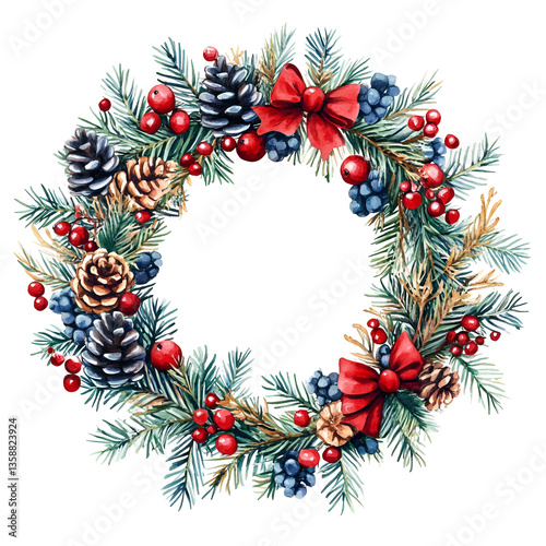 Watercolor Christmas Wreath Pine Cones Berries Bow