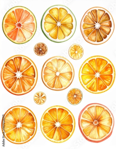 Watercolor Citrus Fruit Slices Illustration of Oranges Lemons and Grapefruit on White