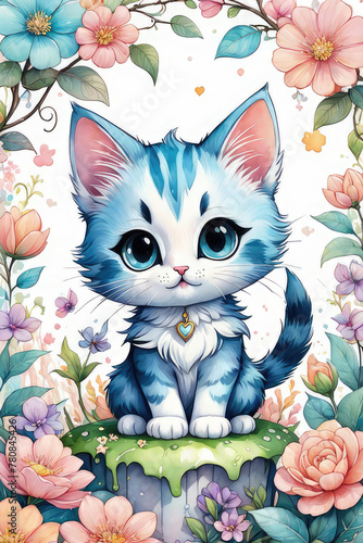 Watercolor composition of cute kawaii funny sitting kitten with flowers, happy kitty.