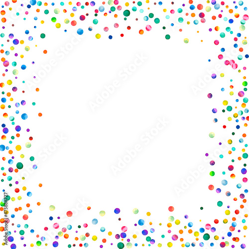 Watercolor confetti on white background. Admirable rainbow colored dots. Happy celebration square colorful bright card. Likable hand painted confetti.