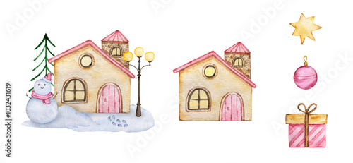 Watercolor Cozy winter house with trees and snow