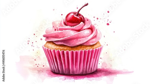 Watercolor cupcake with pink frosting and cherry artful confectionery delight