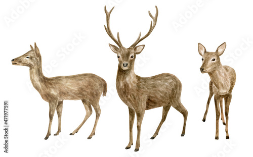 Watercolor deer illustration set. Hand painted realistic buck, doe and fawn deer sketch. Woodland animals drawing isolated on white background. Brown reindeer family, forest mammal.