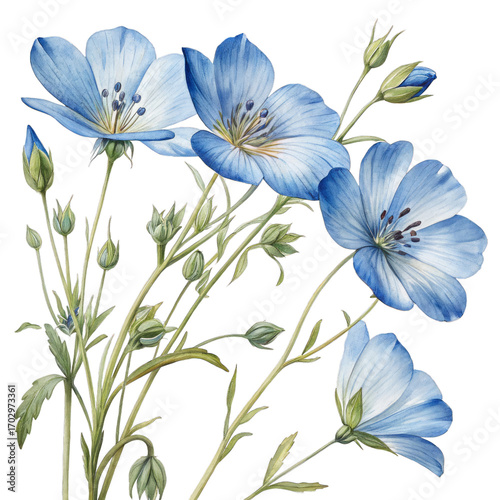 Watercolor Delicate Blue Flax Flowers on Transparent Background