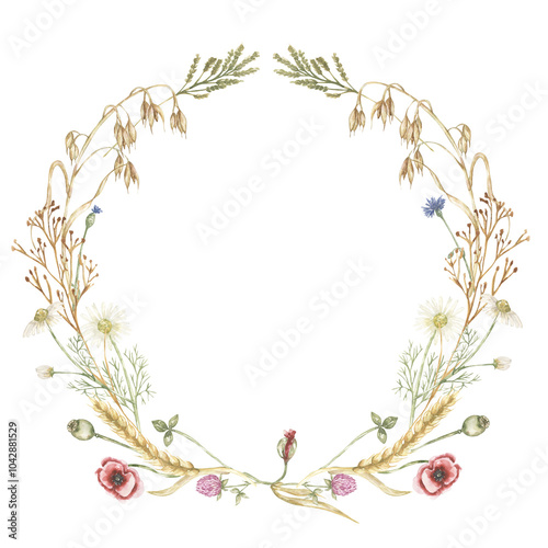 Watercolor delicate meadow flowers wreath illustration, field flora frame clipart, wildflowers arrangement