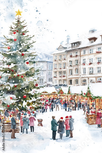 Watercolor depiction of Christmas market stalls with festive decorations, seasonal treats, and people making purchases