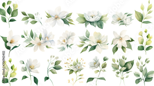 Watercolor drawing, set of white flowers and green eucalyptus leaves