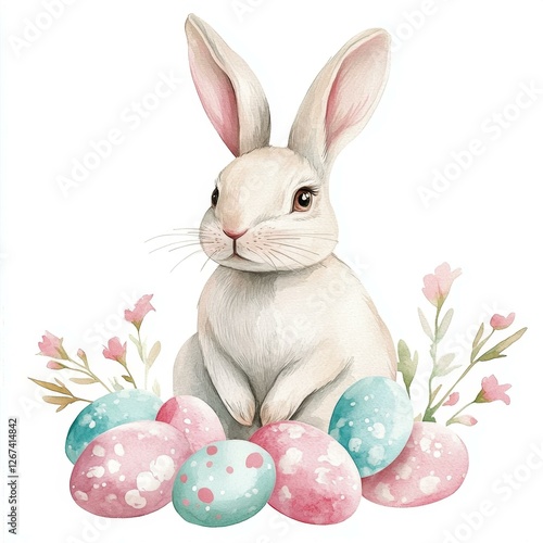 Watercolor Easter Bunny Surrounded by Easter Eggs for Festive Celebration and Decoration