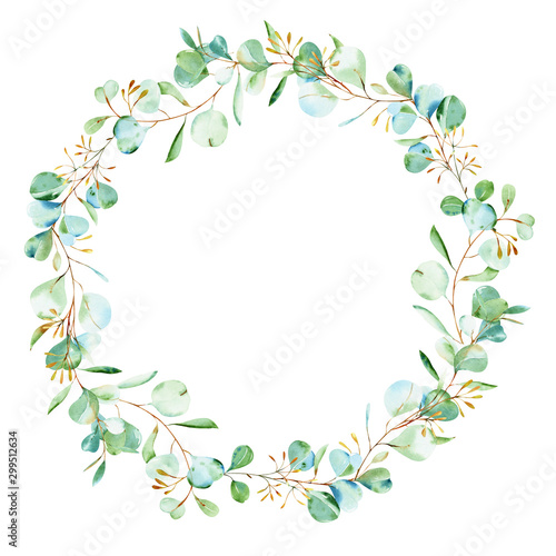 Watercolor eucalyptus wreath in blue and green colours. Silver dollar eucalyptus. Hand painted floral illustration with green leaves isolated on white background. For wedding, design or print.