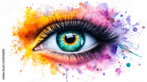 Watercolor Eye Illustration Shows Colorful Splashes with Long Lashes Artistically Painted