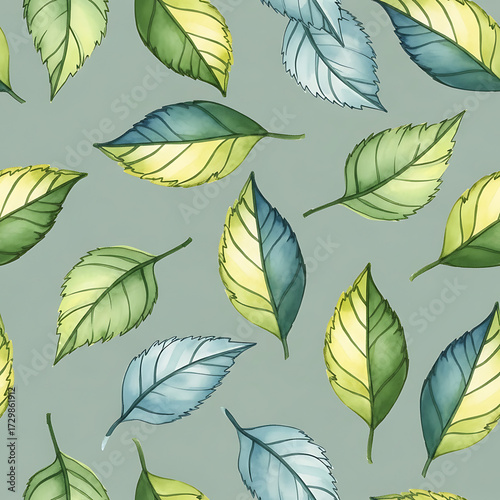 Watercolor floral and leaf pattern of hand-painted wildflowers and sprawling leaves,created for wallpaper and fabric, illuminated with diffused
