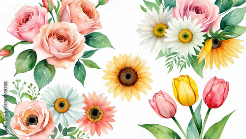 Watercolor floral arrangement featuring roses sunflowers daisies and tulips illustration