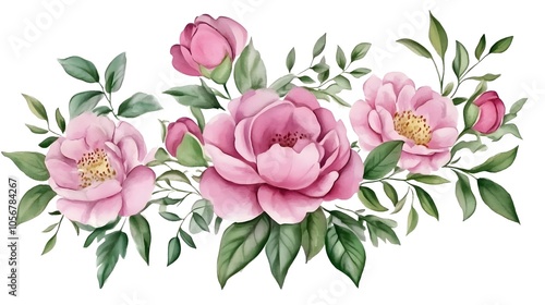Watercolor Floral Bouquet with Pink Roses and Peonies, Green Leaves, Eucalyptus, and Baby's Breath, Isolated on White Background, Ideal Clipart for Wedding Flower Designs and Digital Junk Journal