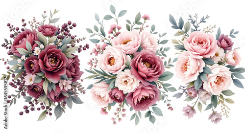 Watercolor floral bouquets with burgundy and blush pink roses, isolated on transparent background.