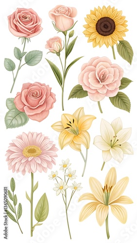 Watercolor Floral Collection, Elegant Roses, Lilies, and Sunflowers Isolated
