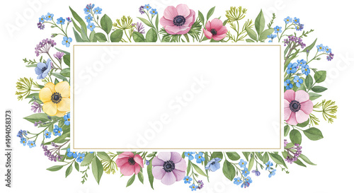 Watercolor floral frame with forget-me-nots and anemones on transparent background