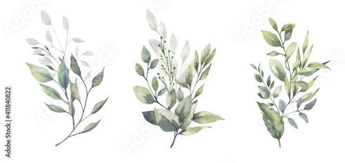 Watercolor floral illustration set - green leaf branches bouquets collection, for wedding stationary, greetings, wallpapers, fashion, background. Eucalyptus, olive, green leaves, etc. High quality