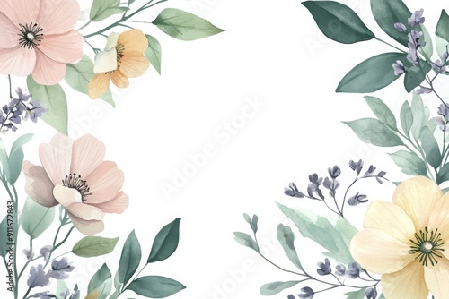 Watercolor flowers with green leaves, frame, background for spring, weddings, birthdays, Mother's day, with copy space