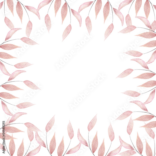 Watercolor frame with pink leaves, twigs with leaves, botanical illustration
