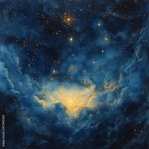 Watercolor Galaxy Painting with Stars and Clouds