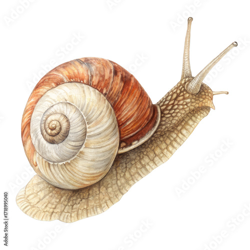 Watercolor garden snail with spiral shell and antennae isolated on a transparent background mollusk