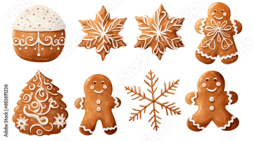 Watercolor gingerbread cookies. Winter homemade sweets in shape of house and gingerbread man