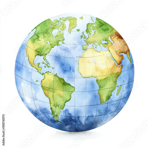 Watercolor globe with continents in vibrant colors isolated design on white background