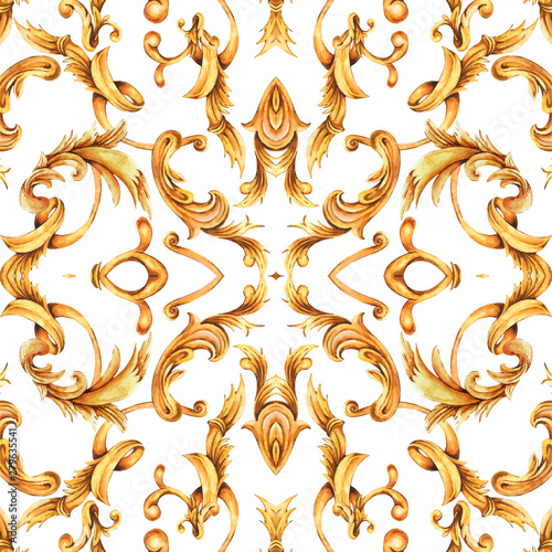 Watercolor golden baroque seamless pattern, rococo ornament texture. Hand drawn gold scrolls, leaves.