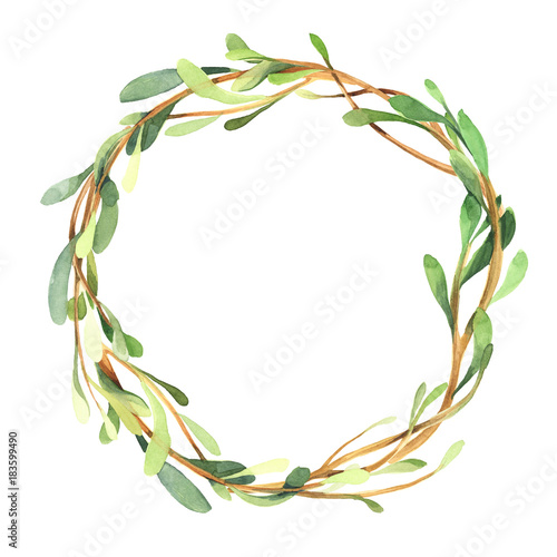 Watercolor green wreath of green buxus branch, leaves and red berry
