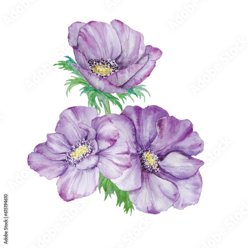 Watercolor hand drawn purple anemones with green leaves isolated on white background.