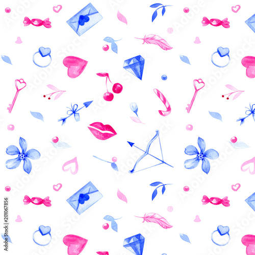 Watercolor hand drawn seamless illustration with love, flowers, ring, arrow, letter, envelope, candy, key, cherry, hearts, feather, lips, leaves.