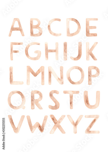 Watercolor hand painted cute latin alphabet letters in light nude brown color.