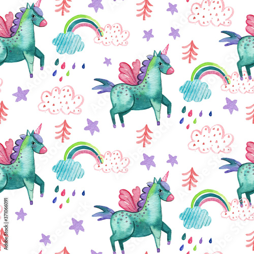 Watercolor hand painting pattern with cute unicorns, clouds, raindrops, rainbow and stars on white background. Magic background with little unicorns.