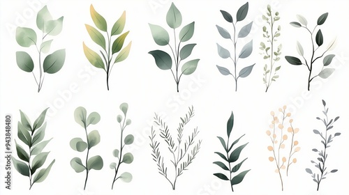 Watercolor hand-drawn illustration of various greenery elements set against a white background. The artwork features a neutral soft color palette with minimalistic design elements, including simple sh