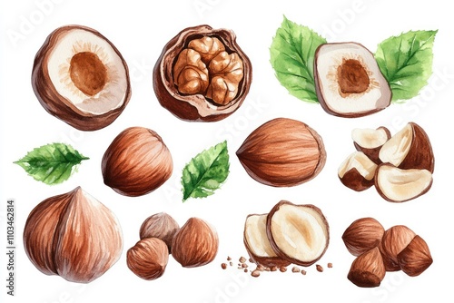 Watercolor Hazelnut Variety. Hand-drawn Food Illustration Set in Brown and White Background