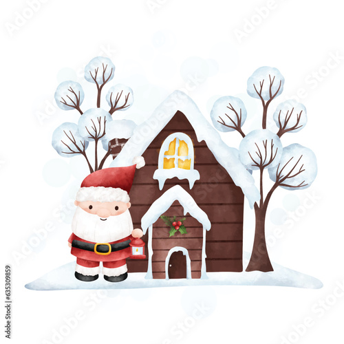 Watercolor illustration cute Santa Claus with wooden house and snow tree