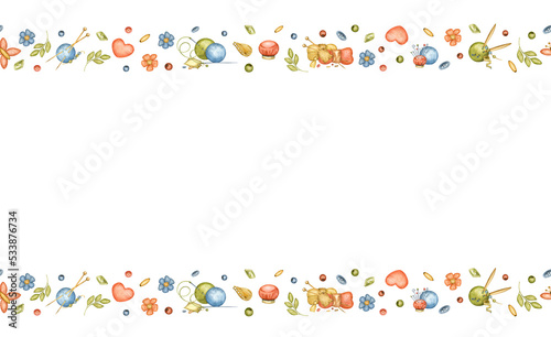 Watercolor illustration, knitting banner, handmade sewing. Isolate on a white background.