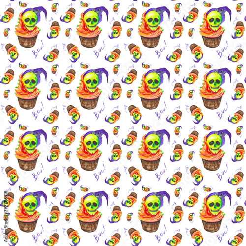 Watercolor illustration of a cake with a skull in a hat on Halloween.Isolated on white background.Seamless pattern