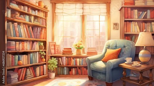 watercolor illustration of a cozy warm home office reading corner with a big window and bookshelf