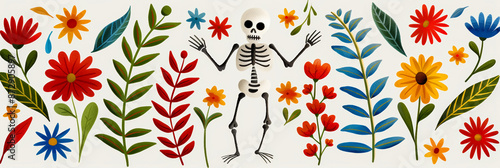 Watercolor illustration of a mystical skeleton marionette dancing among colorful flowers for Day of the Dead bright simple watercolour background banner