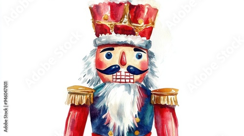 Watercolor illustration of a Nutcracker with traditional attire and festive accents, set against a blank background, ideal for Christmas-themed projects and holiday decorations