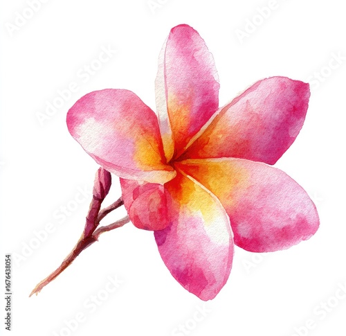 Watercolor illustration of a single, vibrant pink plumeria flower
