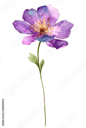 Watercolor illustration of a single, vibrant purple flower with a slender stem. Soft, textured petals and a detailed center