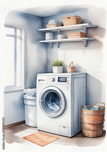 Watercolor Illustration Of A White Blurry Home Laundry Room With Modern Washing Machine Isolated On White Background