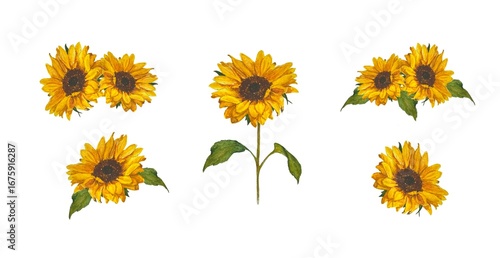 Watercolor illustration of bright sunflowers isolated on a white background. Set of floral elements for design.