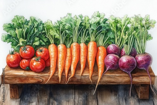 Watercolor Illustration of Carrots Beets Tomatoes and Root Vegetables on Wooden Plank
